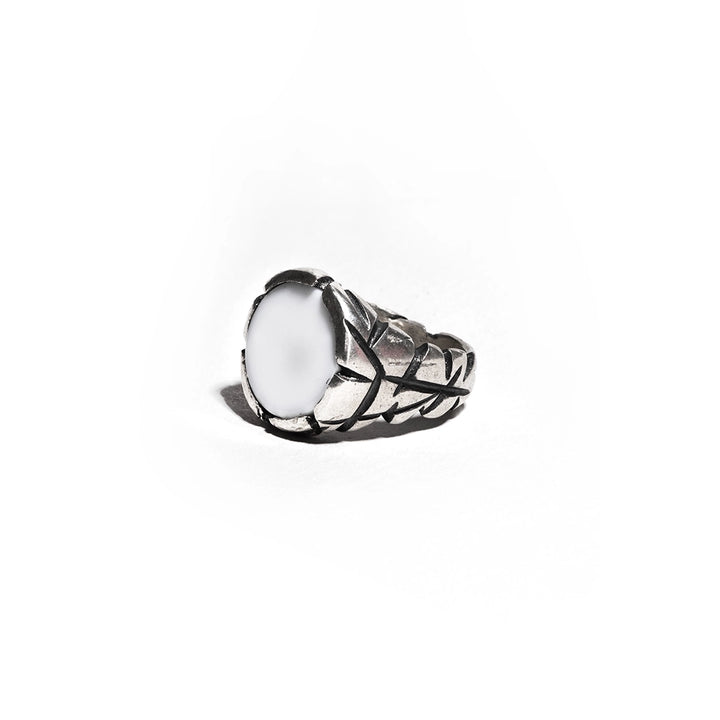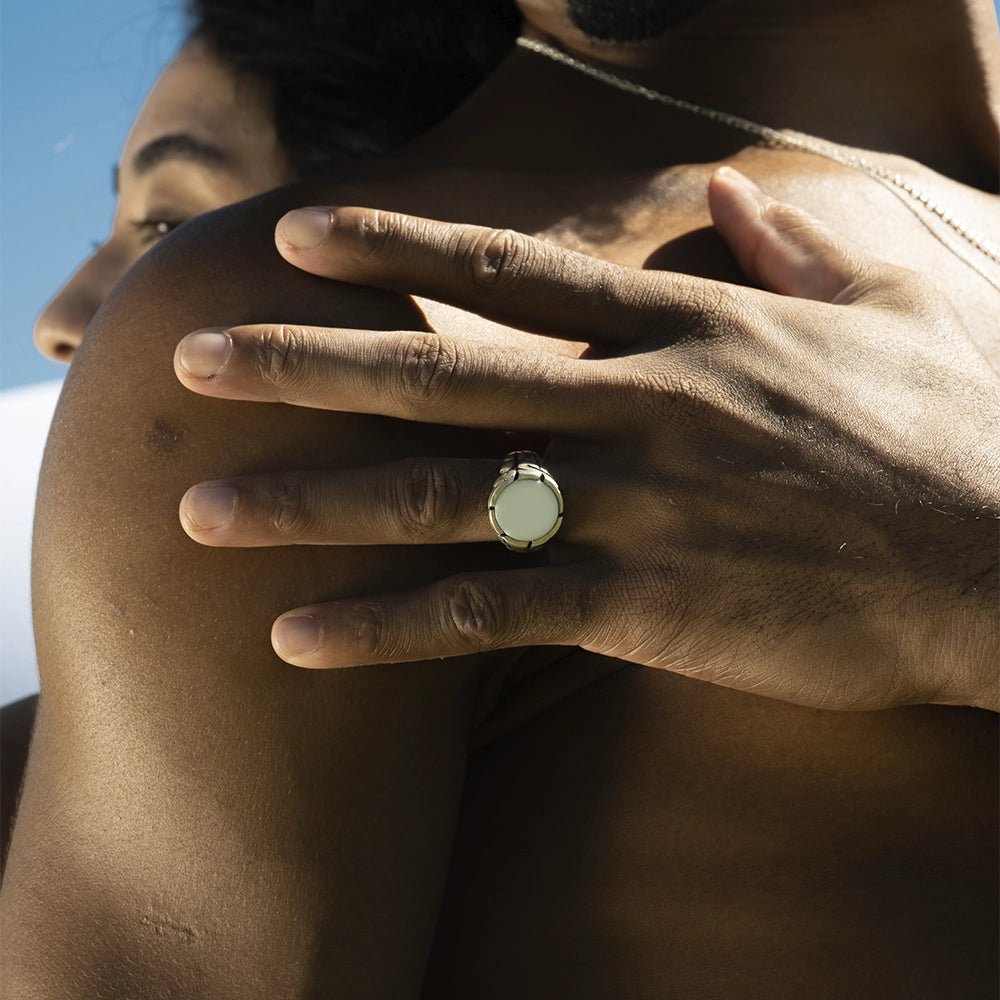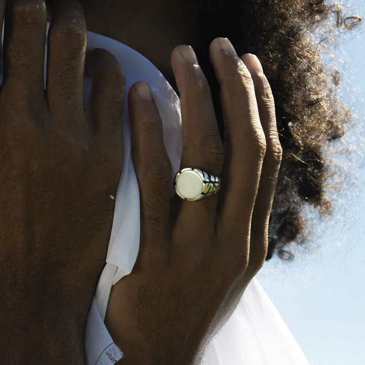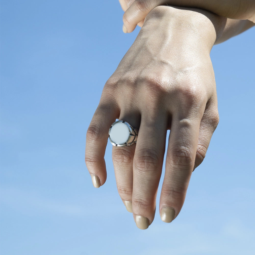 O Anel Genesys pertence ao drop Genesys e está disponível em três pedras diferentes - ágata branca, ônix e madre pérola.